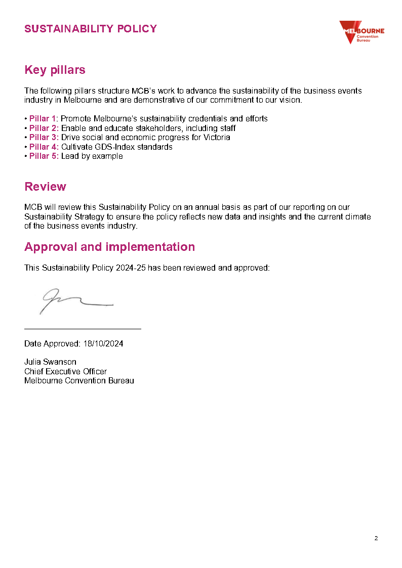 • Sustainability deliverables included in the partnership contracts with City of Melbourne and Melbourne Convention and Exhibition Centre